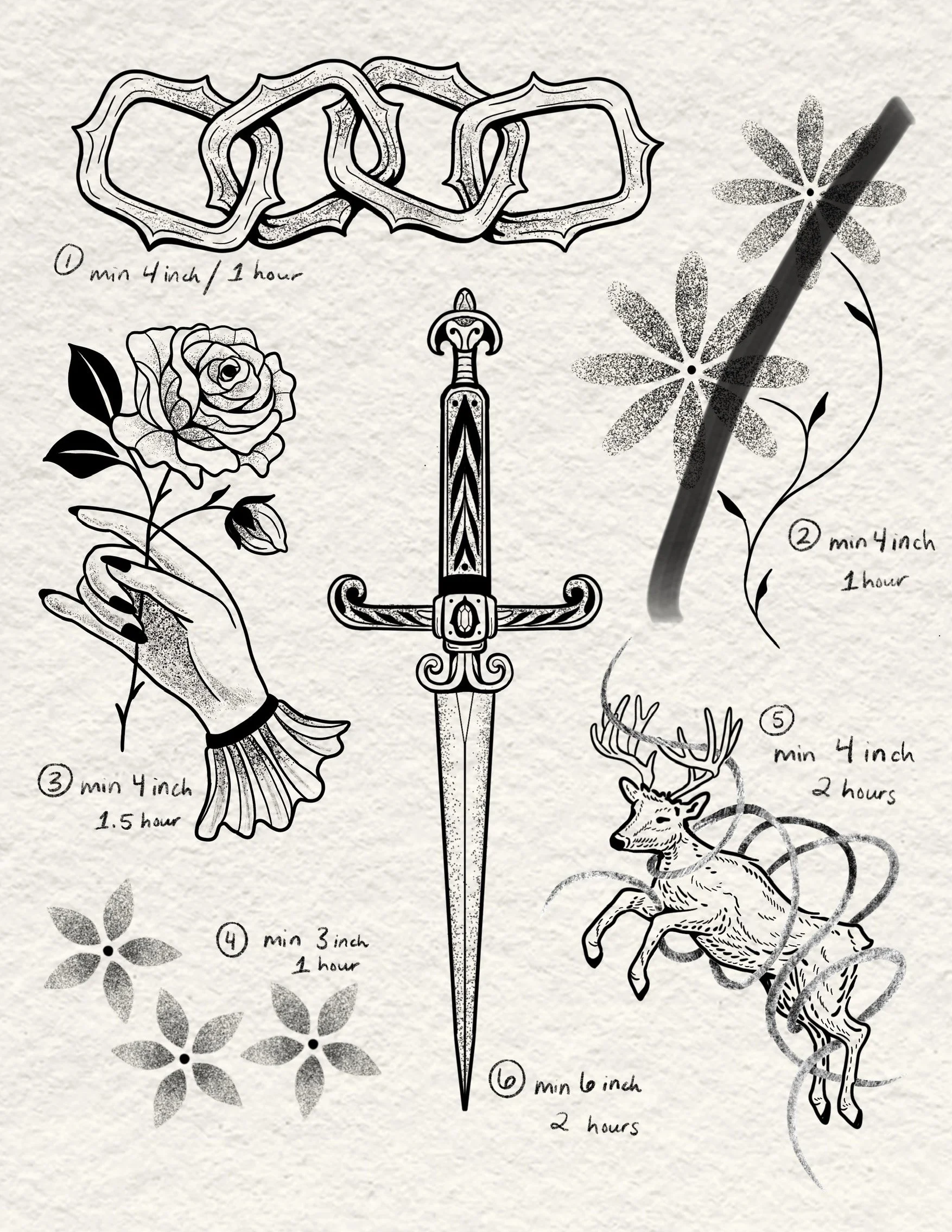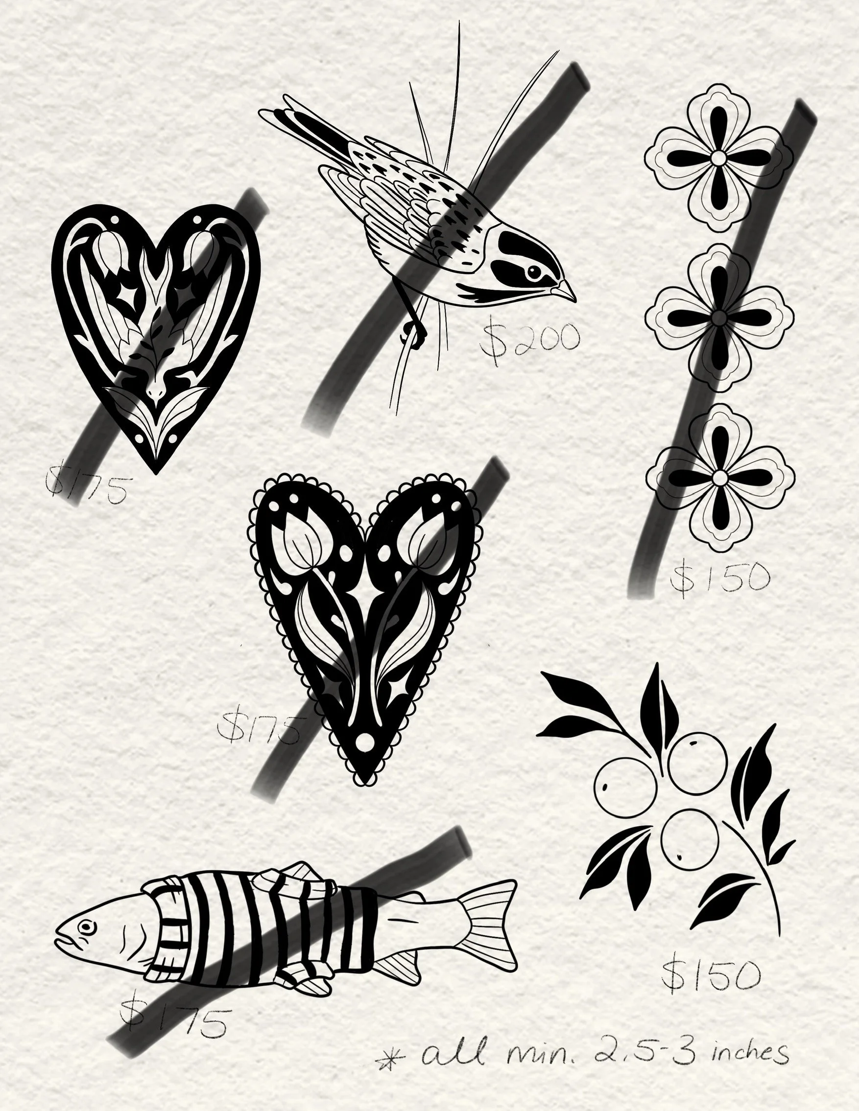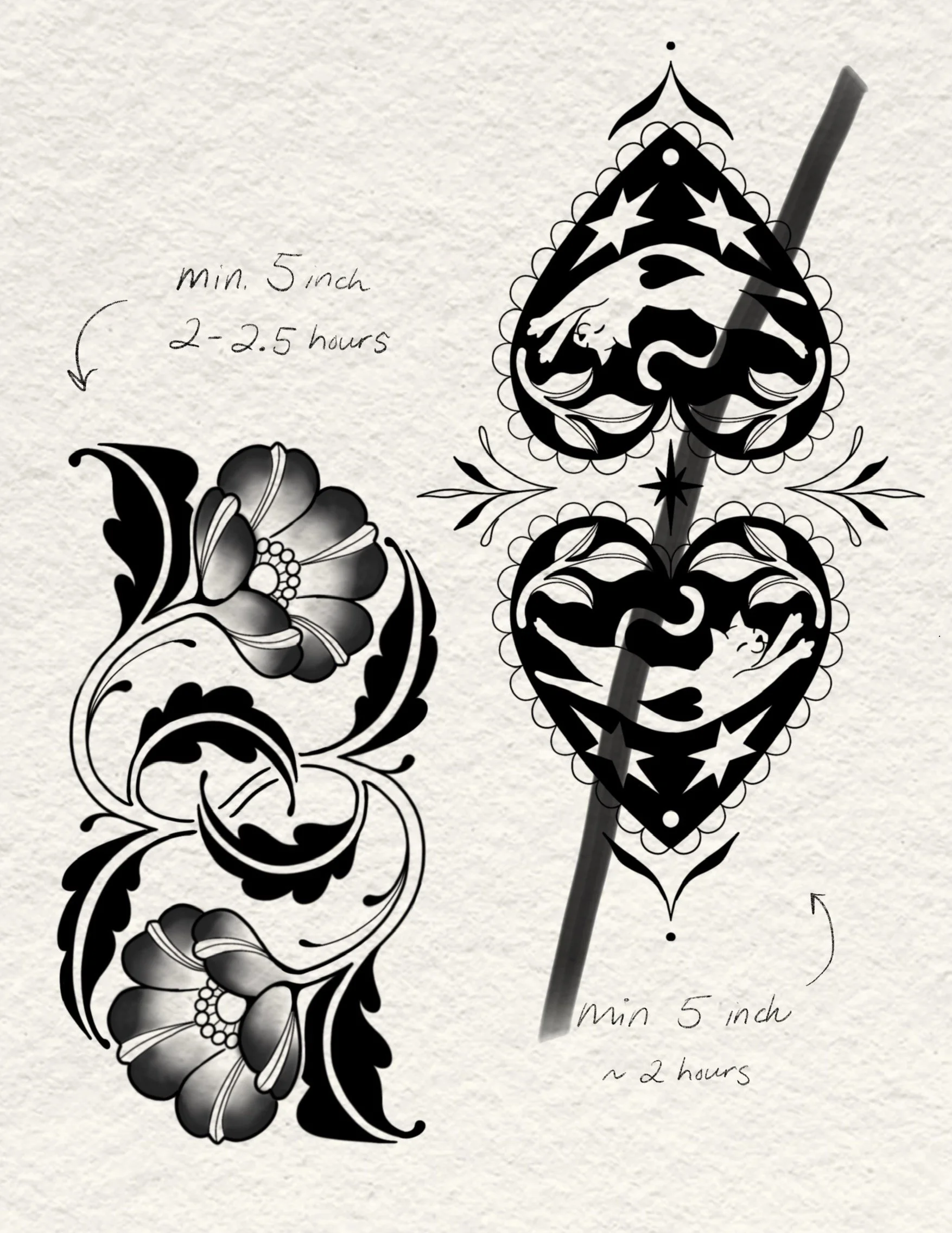 Prices reflect the minimum size and simple placement (arms/legs) - price is subject to increase if the size is significantly changed and/or placed in a more challenging area (ribs/belly/etc)