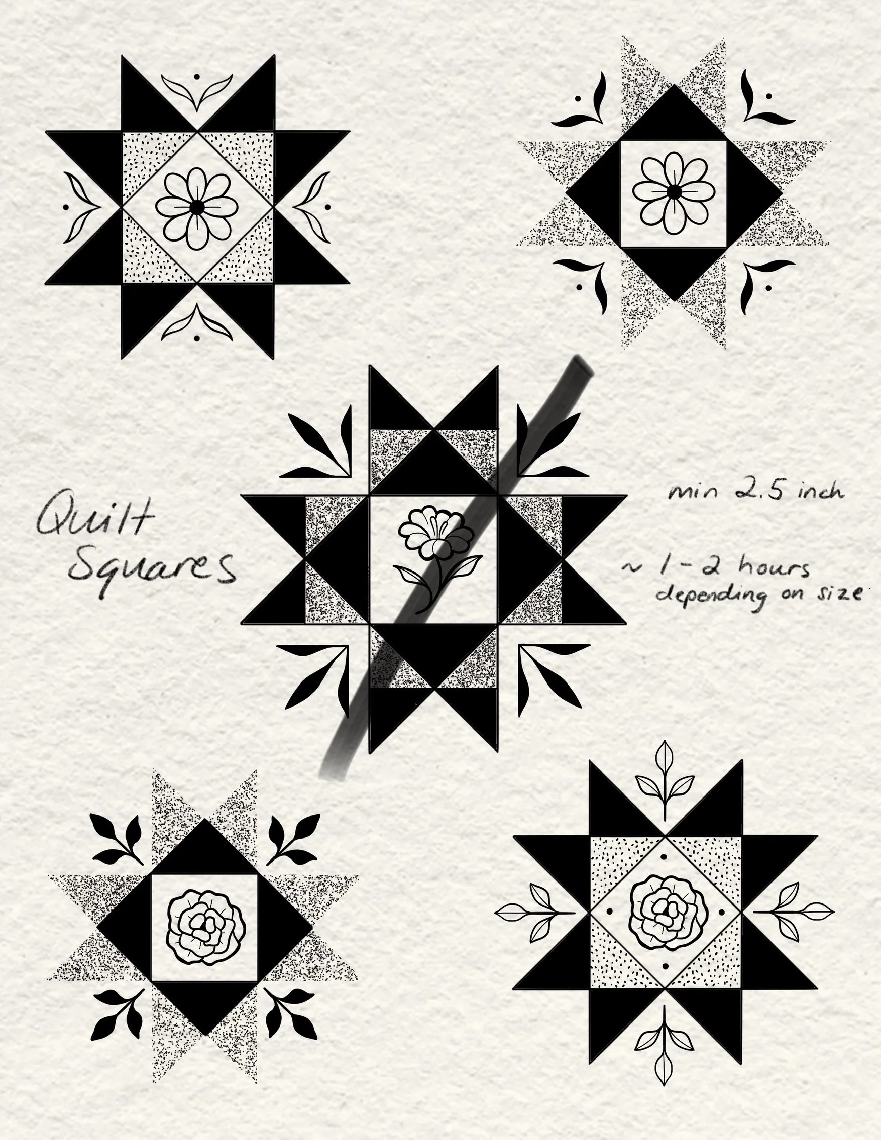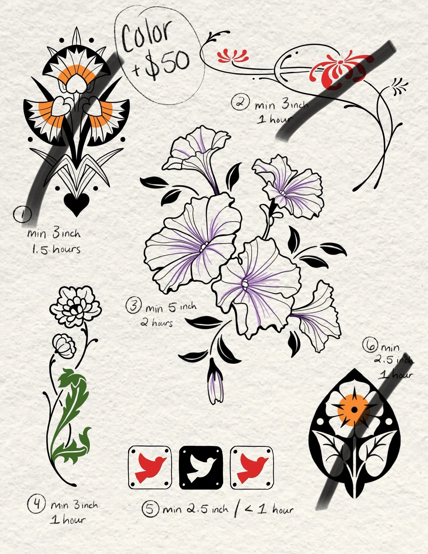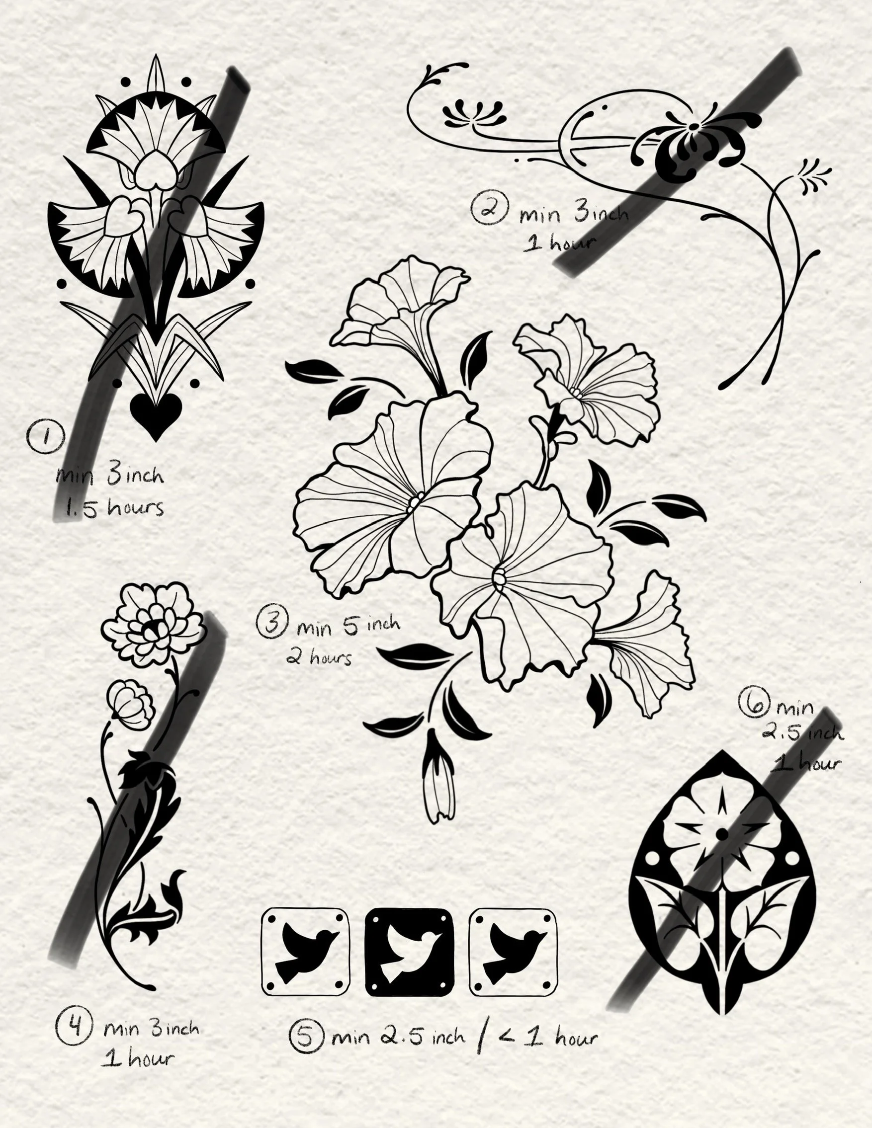 Prices reflect the minimum size and simple placement (arms/legs) - price is subject to increase if the size is significantly changed and/or placed in a more challenging area (ribs/belly/etc)